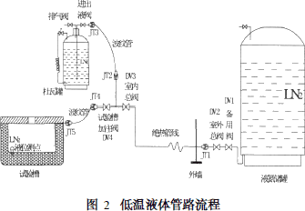 3、液氮管路流程。液氮(dàn)管路流程用於向試驗裝置(zhì)加注(zhù)低溫液體冷卻劑液氮,其流程如圖2所(suǒ)示。