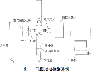 測試(shì)係統的台架總體結構,包括儀表麵板(垂直麵)、閥門麵板(傾斜麵)、儀器架和氣泡光電檢漏係統等部分。儀表麵板上包含電源開關/指(zhǐ)示器、指針式精密壓力表、數字(zì)式壓力表、溫度數顯儀和試驗時間計時器等。氣泡光電檢漏係統的原理性示意圖如圖3所示。