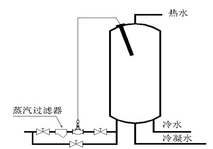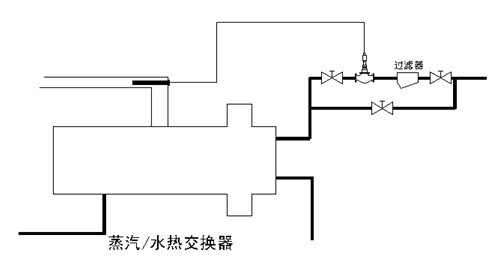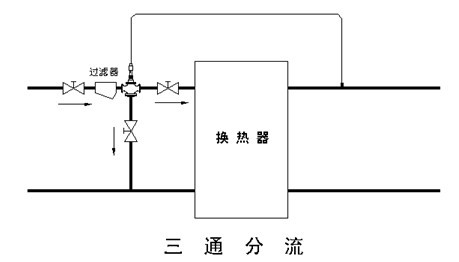 2. 閥(fá)體安裝前應清洗管道,不得有雜物。閥體安裝時必須垂直於地麵,閥體進口方向與熱媒介質流動(dòng)方向一(yī)致。本溫度(dù)調節閥前後應安裝截(jié)止閥且調(diào)節閥前應安裝過濾器(qì),以免雜質損傷密封表麵。為方便用戶的使(shǐ)用及調節(jiē)閥的檢修,應設置旁通管路並安裝截止閥,請參看示意圖。