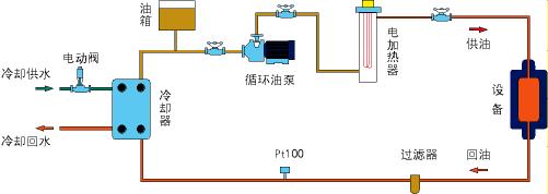 導熱油溫控裝置(zhì)為閉式循環結構,以電能作(zuò)為加熱源、以油泵作為循環動力,控製櫃的溫控(kòng)單元(PLC或溫控表)通過溫度傳感器檢測回油溫度,控製(PID)電加熱器和冷卻閥(或風機),進而控(kòng)製(zhì)加熱和冷卻過程:油經過加熱器加熱後,通過油(yóu)泵強製循環(huán)將熱量傳送至設備,油在設備中放熱並對設備進行加熱後溫(wēn)度下降,再循(xún)環至加(jiā)熱器進行循環加熱;當(dāng)溫度超過設定溫度時,加熱器(qì)停止,開啟(qǐ)冷卻閥(或(huò)風機)進行冷卻,保持(chí)裝置溫(wēn)度恒定在設定的工作(zuò)溫度。