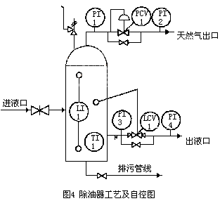 2、自力式(shì)調節閥在河南油田已有十幾年(nián)的使用曆史,已得到了實踐的檢驗(yàn)和成功的(de)應用。典(diǎn)型(xíng)應用:油氣水三相分離器的壓力控製,油室、水室液(yè)位控製(zhì),如圖3所示;除油器壓力、液位控製(zhì),如圖4所示;氣液分離器、緩(huǎn)衝罐(guàn)壓力、液位控製(略);居民區供暖(nuǎn)分支管線的流量、溫度控製等(略)。