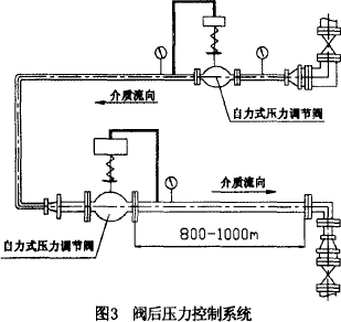控(kòng)製係統為穩定閥後壓力的係(xì)統,介質為氮氣,係統的初始管(guǎn)道壓力為2800KPa,後工段所需要的最大流量為2000NM3/h。工藝要(yào)求是後工段使用介質10分鍾後停止使用1小時,並(bìng)按(àn)此方式循環使用;正(zhèng)常使用時閥後壓力穩定在700KPa,停止使用時閥後(hòu)壓(yā)力不得高於800KPa。閥後輸送管道長度為800∼1000米左右(yòu)(如圖3所示)。
