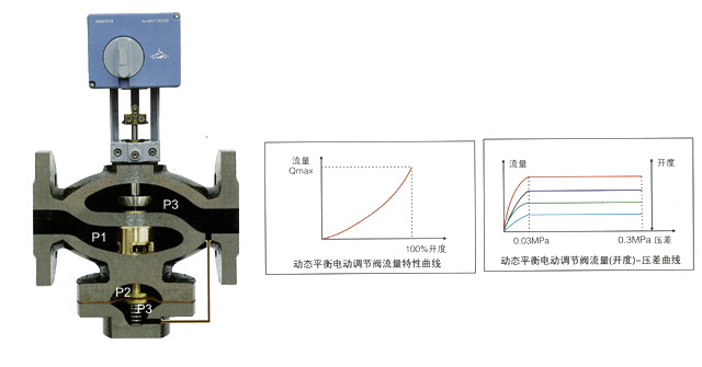 (2)當電動執行器接受(shòu)控製信(xìn)號使閥杆向上或向(xiàng)下運動,使閥塞開大或關小,P2、P3間(jiān)的開度也隨之變化。由於(yú)不管係(xì)統壓差如何變化,P2、P3間的壓差(chà)(P2--P3)始終不(bú)變,因此對應於任一開度位置,其輸送的(de)水流量都(dōu)是一定的(de)。