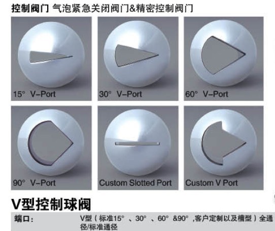 氣動V型(xíng)球閥是一種90度旋轉的(de)高級控製閥,其主要作用為調節,也可做為開關閥使用,V型球閥閥芯設(shè)計成帶有特殊形狀V型缺口,具(jù)有(yǒu)很強的剪切(qiē)能力及自潔能力。尤其適用於纖維和含(hán)有固體的微(wēi)小顆粒。全V形切口球體旋轉控(kòng)製閥驅動軸球(qiú)體係列,改進了節流(liú)口設計,提高了控製(zhì)精度,延伸了小流量控製功能。 氣動V型球閥球芯形狀: 氣動V型球閥流量特(tè)性圖: