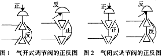 (2)氣閉式調節閥(fá)。圖2為氣閉式(shì)調節閥的正(zhèng)反圖,當閥門定位器給調節閥膜頭(tóu)發(fā)送關閥的(de)壓力信號時,如果閥杆太短,閥(fá)芯向下(或向上)移動距離不夠,造成(chéng)閥芯和閥座之間有間隙,而不能充(chōng)分(fèn)接觸,導致調(diào)節閥關不嚴而有漏。同樣,如果閥杆太長,閥杆向上(或向下)移動距離不夠,而不能充分打開閥芯導致調節流量太小。