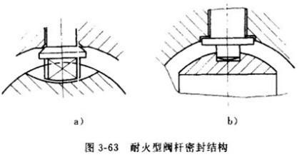 3-63為耐火型閥杆(gǎn)密封結構;一旦失火,軟質填料被燒毀或軟化,閥體體腔內的流體壓力(lì)將閥杆推向閥體閥杆上的台肩被閥體擋住,並藉高壓流體壓力作用壓緊而(ér)密封;此外,它還能(néng)防止腔內異常(cháng)升壓時閥杆衝出體外。