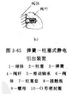 圖3-65a所(suǒ)示(shì)為彈(dàn)簧一柱塞式靜電(diàn)引出裝置。壓縮彈簧加載於柱塞,使球體與閥杆以及閥(fá)杆與閥體之間形成靜電通道。這樣,因摩擦產生的靜電便通過彈簧一(yī)柱(zhù)塞傳到閥杆和閥體,從而通過管道與(yǔ)地接通,達到消除靜電積累之目的。