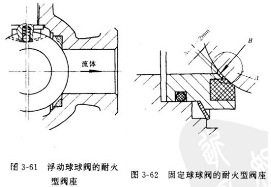3-61為浮動球球閥的耐火型閥座密封結構。一旦失火,其高(gāo)分子(zǐ)材料閥(fá)座被燒毀,球閥的球體(tǐ)在流體壓力作(zuò)用下,就會向閥後閥(fá)座方向推進,使之與加工成直角(jiǎo)的閥體閥座槽金(jīn)屬座麵接觸。起到臨時和部分密封作用.避免災情進一步擴大。