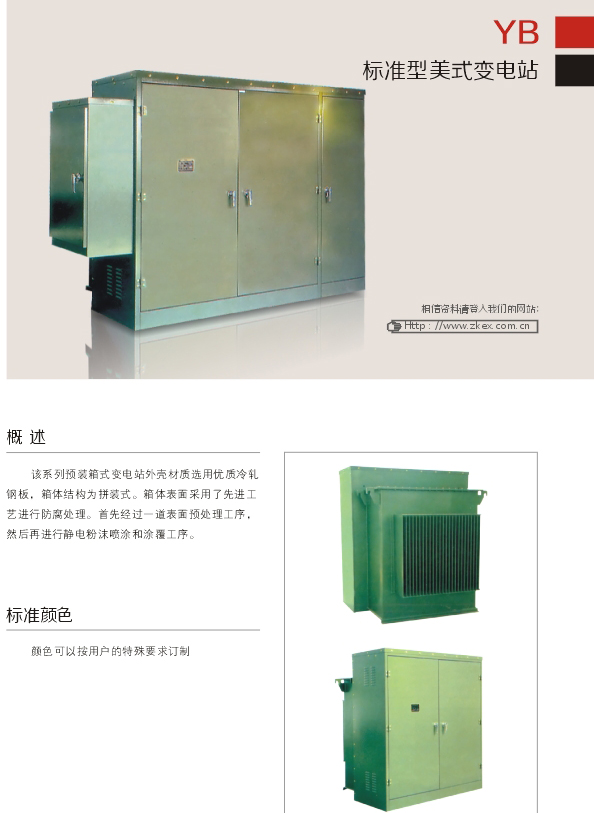 該係列預裝箱式變電站外殼材質(zhì)選用優良冷軋鋼(gāng)板,箱體結構為拚裝式。箱體表麵采(cǎi)用了新型工藝進行防腐處理。首先經(jīng)過-道表直預處理工序,然後再進行靜電粉沫噴塗(tú)和塗覆工序。